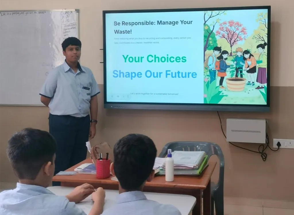 A student delivering an insightful PPT presentation on Waste Management & E-waste, guiding their peers on causes, effects, and sustainable solutions.